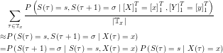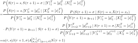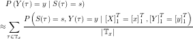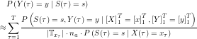 I do not quite understand how to derive the last step in EM-Update Rule to estimate P(Y|S), Why we have to divide P(St = s, Yt = y | Y(1->T), X(1->T)) by |Tx(t)| and na (or no? I cannot see it clearly). I am wondering if you can give some clue on deriving it?
