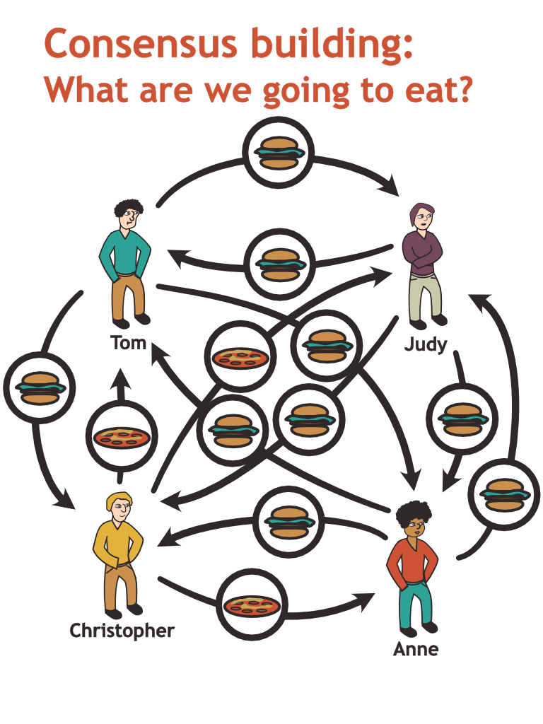 Let us first consider what Consensus means. Consensus is a term used in the study of distributed systems describing a situation in which multiple distributed participants agree on a state without relying on central coordination. The only thing they have at their disposal to negotiate this shared state are messages that they send directly to each other.