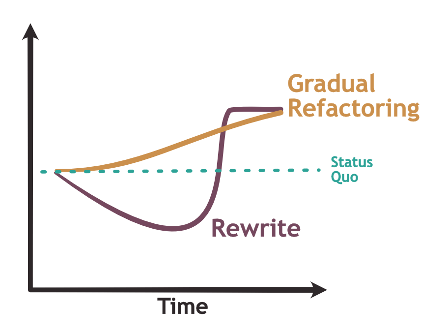 Sometimes the response to these challenges is: Let’s rewrite all of it. I think that this is a very risky approach that can easily land the project in an in-between state which is worse than the place where it started from.