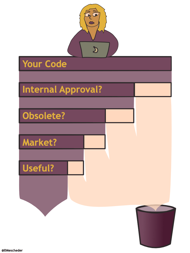 The first hurdle that your code needs to clear is internal approval. Code can go to waste because of project cancellations and changes in strategic priorities. A factor contributing to code not clearing this hurdle is slow time to value: As long as it is unclear whether code is valuable or not, its fate hinges mainly on the goodwill of the management.