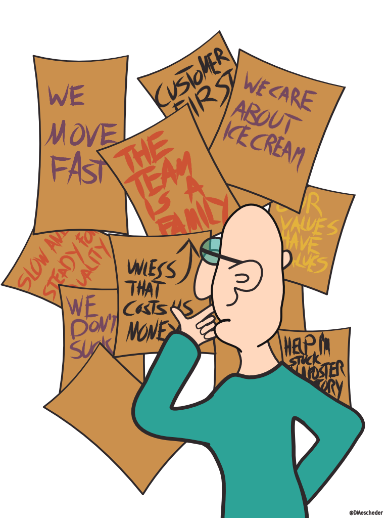 Senior leadership did the analysis: The root of the problem at XYZ Corp was a lack of clearly defined value statements that underpin the company’s unique culture! Problems like this demand the corporate weapon of choice to jump into action: The Workgroup. The Workgroup started to flesh out a series of carefully crafted statements that should form the lifeblood to revitalize XYZ Corp (they made sure to get some help from BainKinsey Group to get the messaging just right!). As one of the values of XYZ Corp would be a data-driven culture, a scientific experiment was run: Two subsamples of employees were asked to rate different statements on a scale from one to ten. This data was then used in the final phase of the process: The Executive Tug Of War! Based on The Data and the stories told of the great culture over at Apmasoft and Spotifix, the executives negotiated a set of statements that seemed fitting (and that, no doubt, carefully avoided threatening any one of the executives’ turfs). The big day was finally there: A branding and design agency had been tasked with the production of posters and slides, an all-hands was called, and, with great fanfare, the CEO rolled out what would become the foundation of XYZ Corp 2.0. As the all-hands dragged on, Eric, a senior engineer in the audience, started to get a bit nervous: “Sure, it is nice we will get some new wall decor” he thought to himself, “but when can I finally get back to my project which is due on Thursday?”